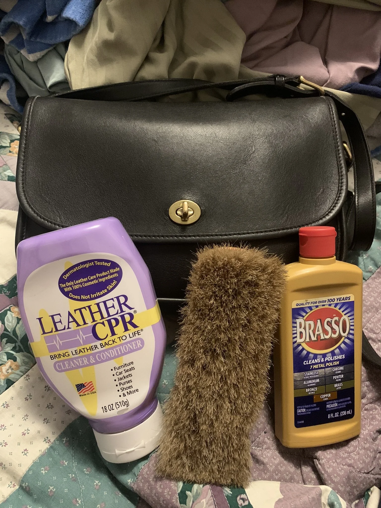 Reconditioned Coach leather bag purchased at Salvation Army. Materials used: Water, yellow saddle soap, horsehair brush, Leather CPR, and Brasso