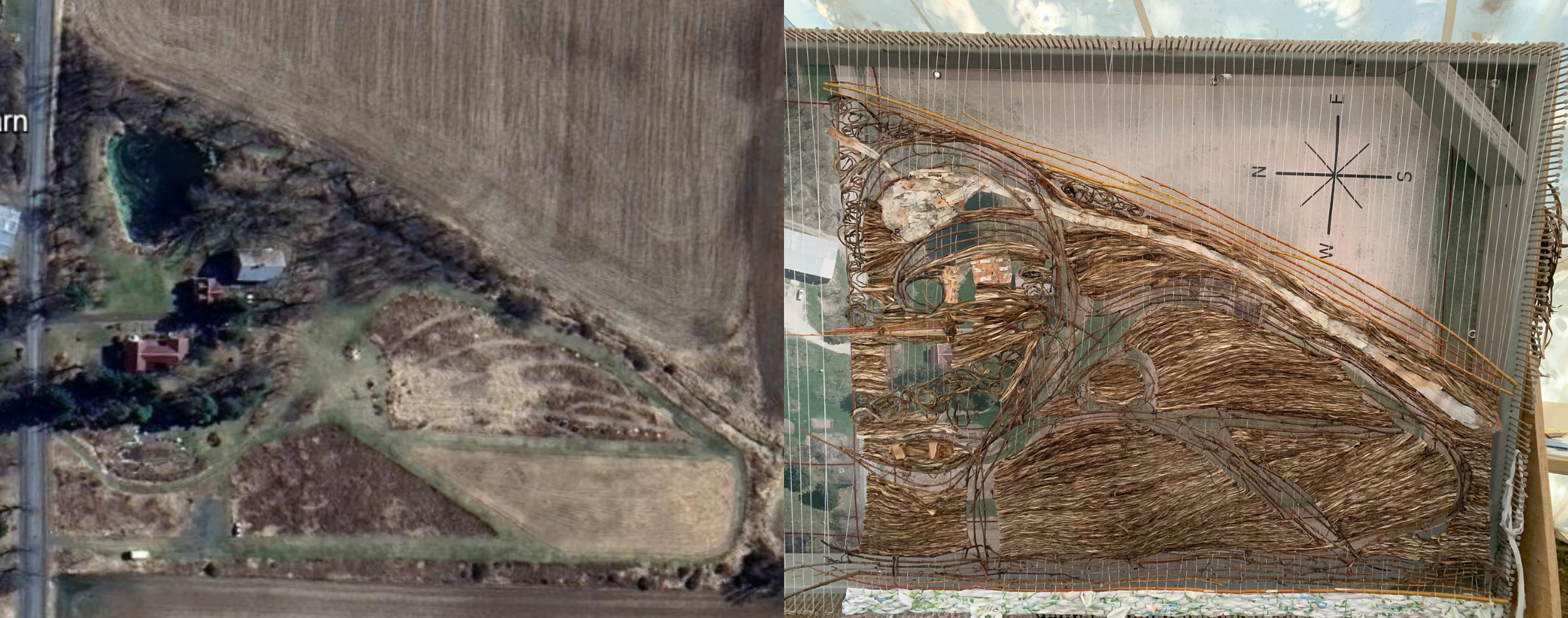 With my mixing of materials I was able to mimic sections of the map in way that clearly translates when you see the weaving and the aerial map side by side. Daylily for large grass and meadow areas. Grapevine for walkways. Straight willow for the driveway and property border. Birch bark for the creek, pond, and also for the house and barn, irises twisted and swirled for the trees and hedgerows, one loan corn leaf for the vegetable garden, and bittersweet and locust added at the end to create a frame around the weaving, that rather than containing the project felt like it shares that this one section of land expands out beyond the borders I limited myself to.